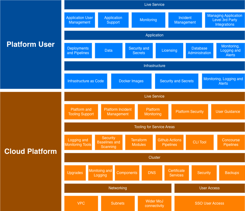 In general the Cloud Platform team is responsible for the platform infrastructure, for example the Kubernetes cluster, networking, and provided tooling such as Terraform modules or infrastructure deployment pipelines.
